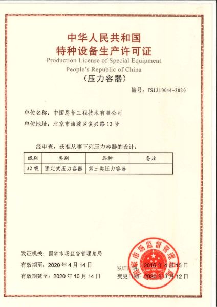 • ÖлªÈËÃñ¹²ºÍ¹úÌØÖÖ×°±¸Éú²úÔÊÐíÖ¤£¨Ñ¹Á¦ÈÝÆ÷£©